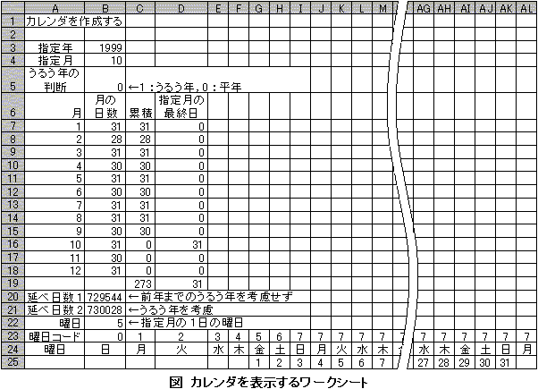 カレンダを表示する考え方に基づいた計算式を、セル